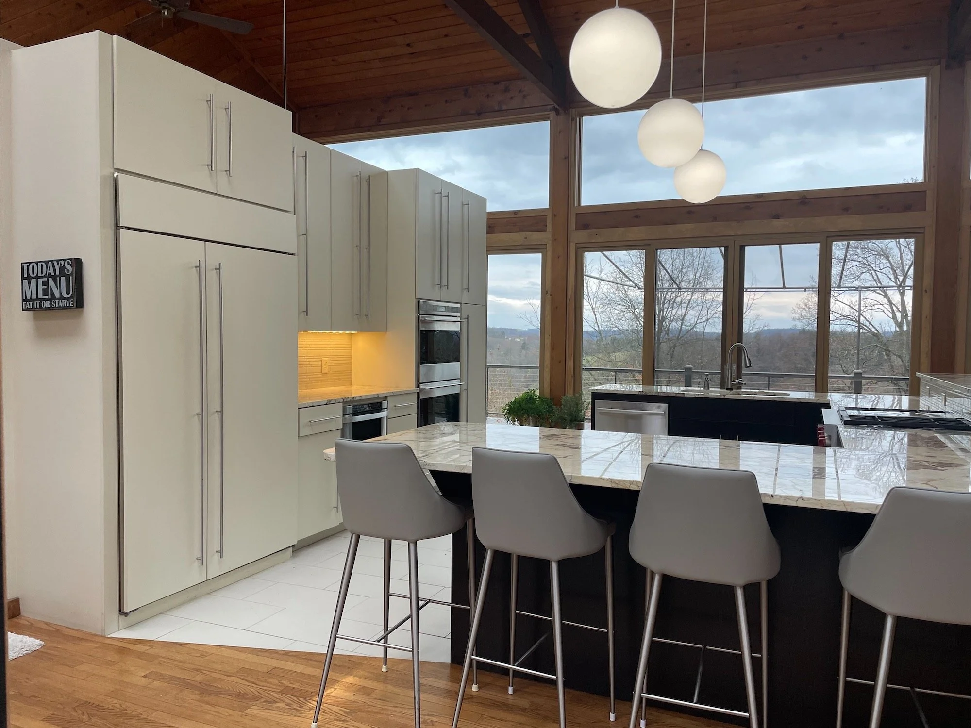 By moving the kitchen back to align up with the windows (and reducing the giant, over-sized laundry room to a still, large room, the kitchen was suddenly the heart of the home. I chose not to replace any walls, other than the back wall, because of those views. Instead, we used what is called a floating kitchen—with no uppers on three sides. That meant the remaining wall had to do double duty with storage, which it did, as we utilized 9′ of the wall in cabinetry. Around the corner of that wall is more cabinetry and storage, as well as a desk and computer for the owner to use when she wanted.