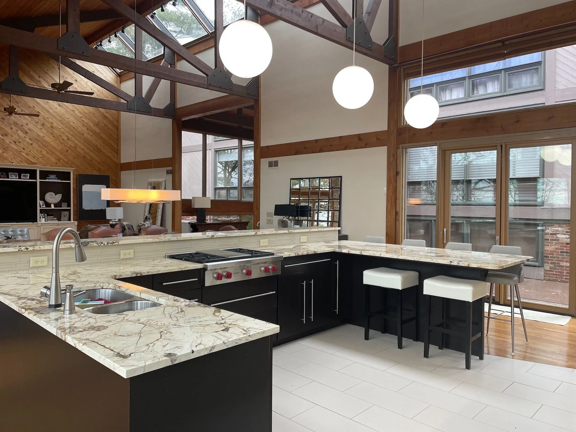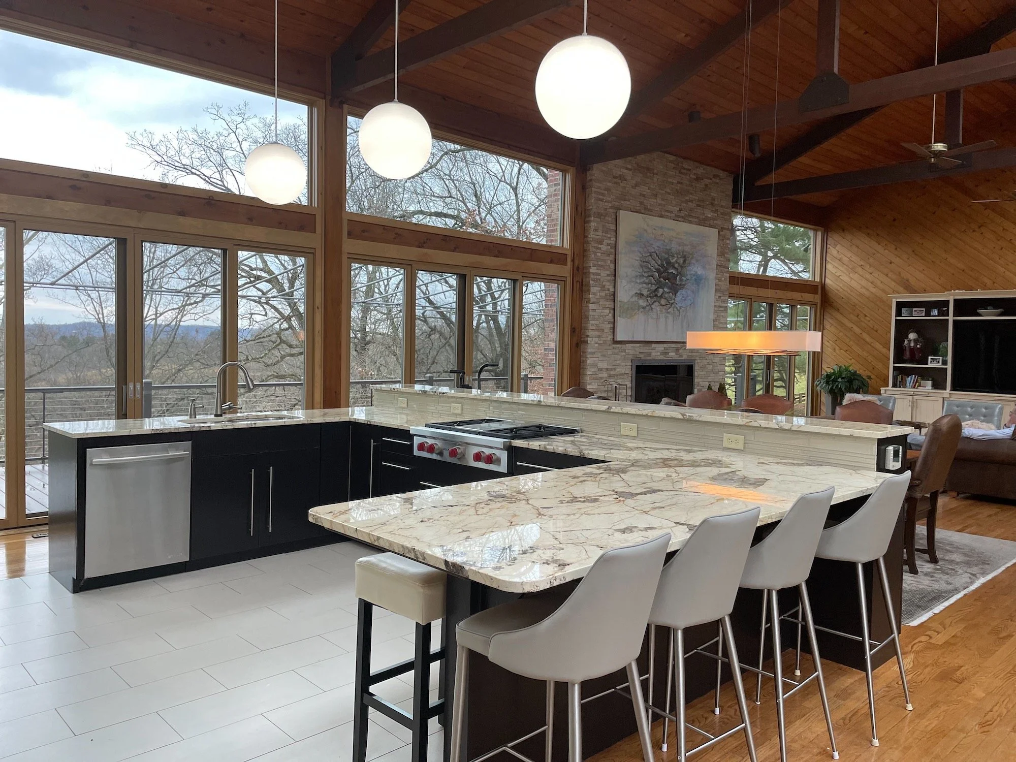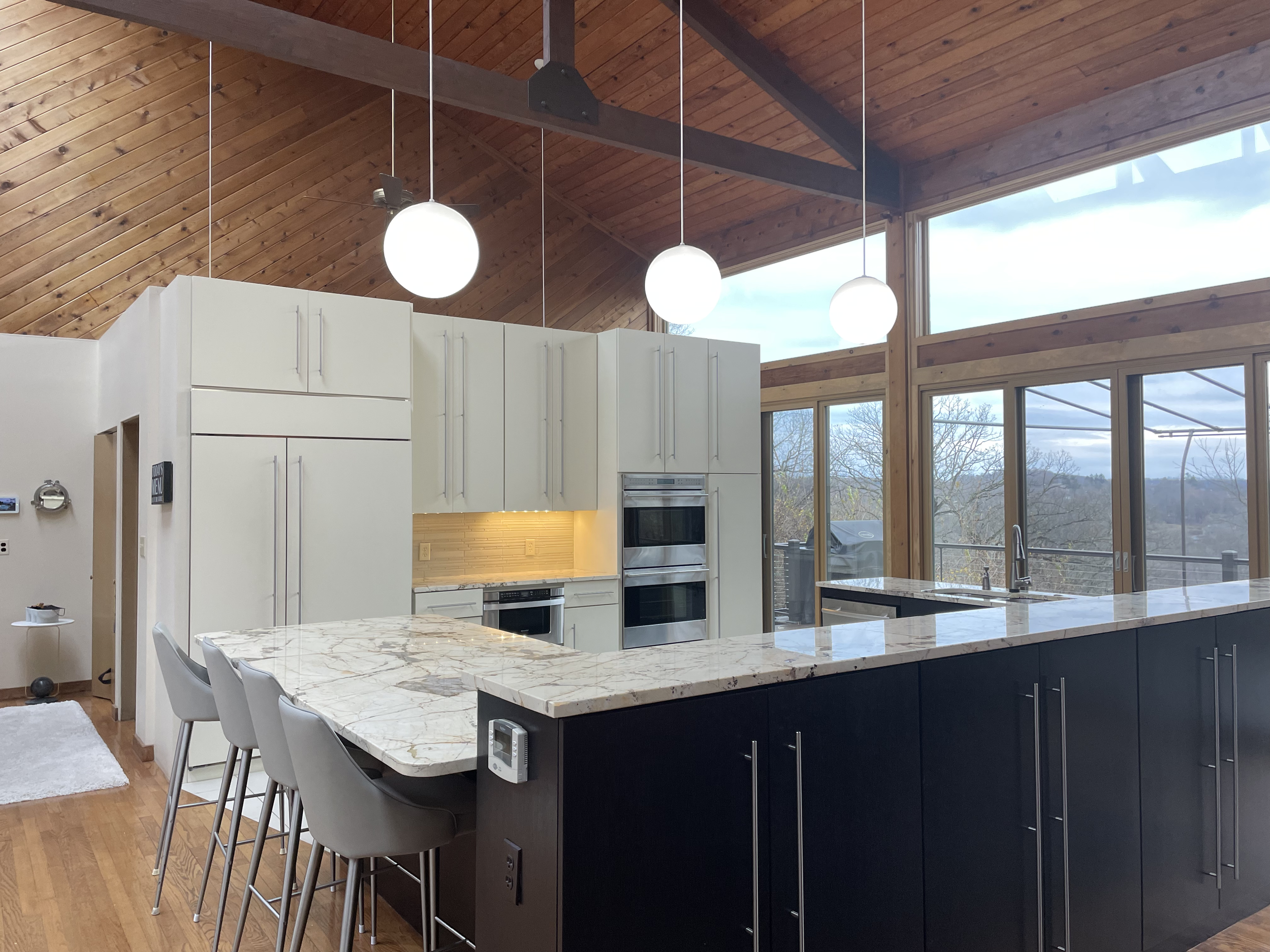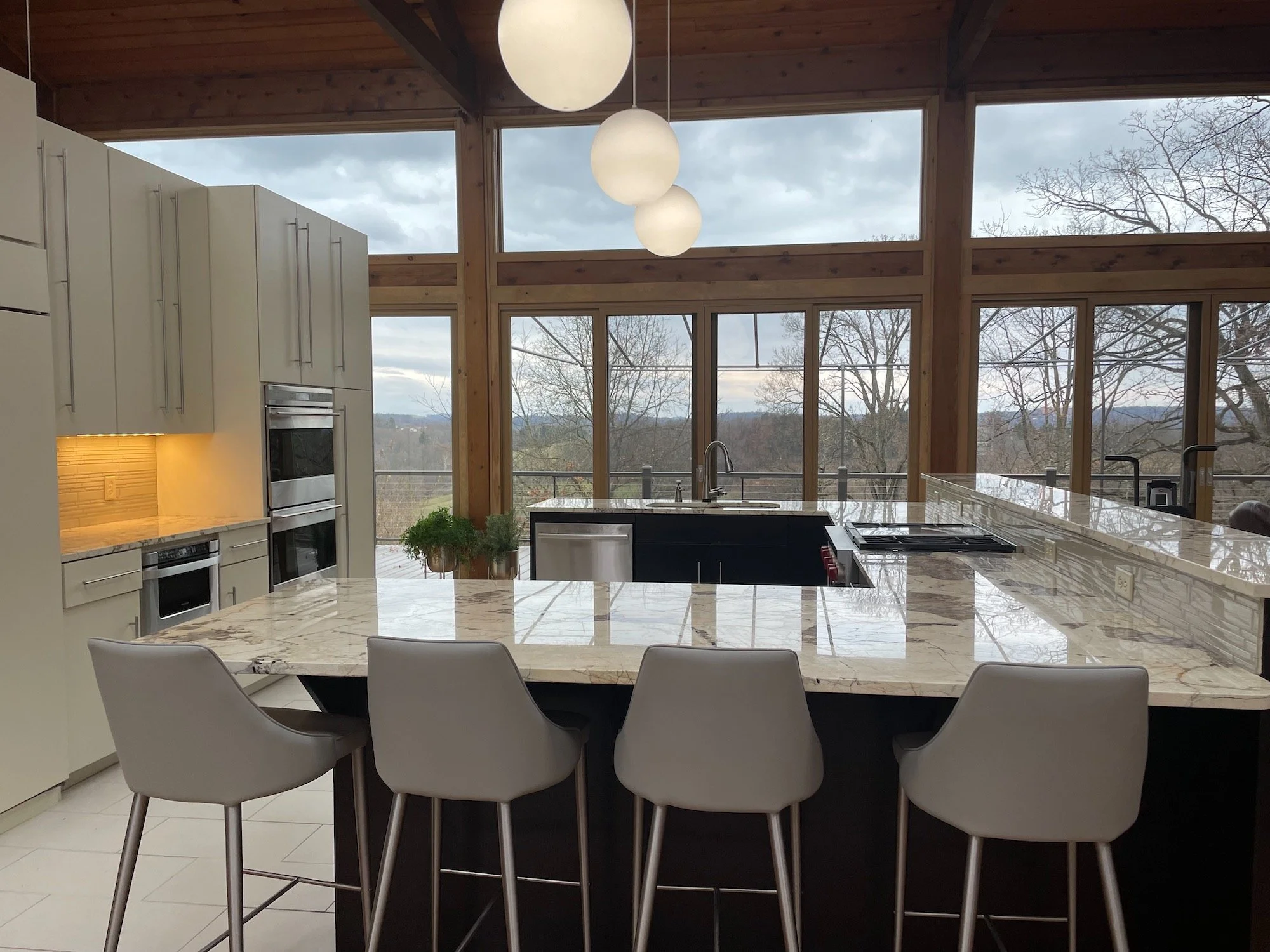 This project had to be approached from a carefully planned, less-is-better approach not only because a famous architect had built this house in the early 1960s but also because it had great bones. What it needed was modernized as well as freed. By that I mean, the kitchen was a product of old-thinking. It had been totally enclosed in a paneled box right in the middle of that expansive room, yet right outside those little walls were the best views anyone could ask for.